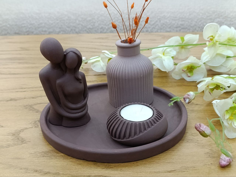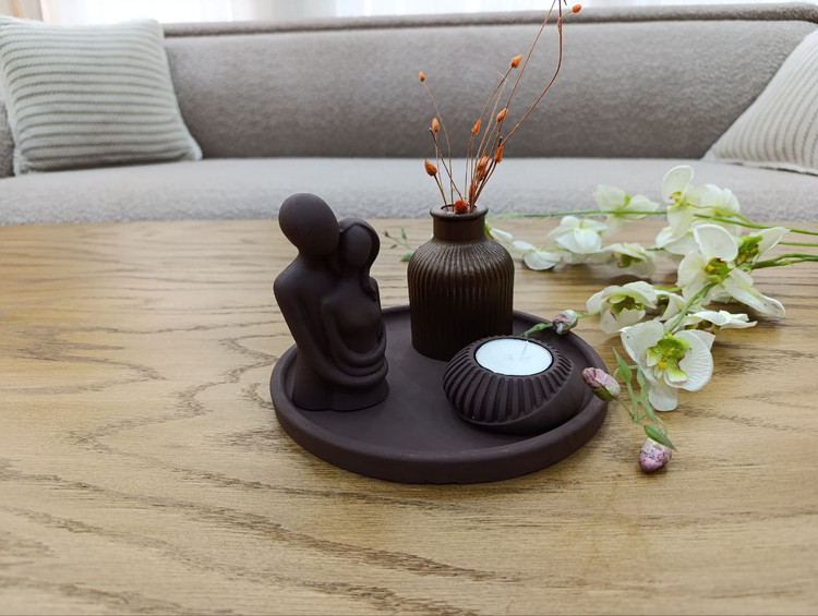 ست دکوری شامل ۴ قطعه دکوری بسیار زیباست یک سینی گرد +مجسمه دکوری آغوش+جاشمعی+گلدان دکوری مراکشی زیباست ،