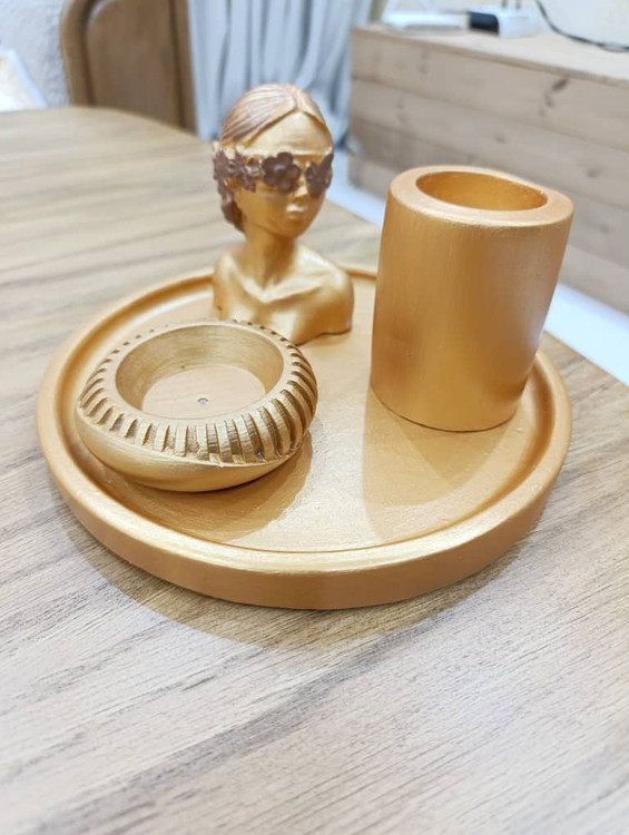 اجزای ست: سینی،مجسمه دکوری ناتالی،جاعودی شیاردار،جاشمعی استوانه ای