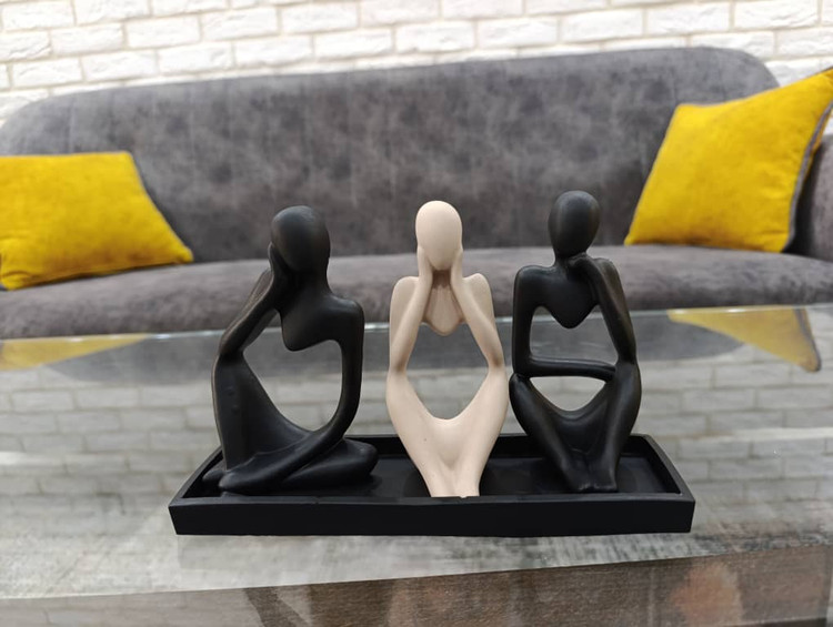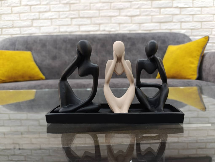 طراحی سه مجسمه با سایزهای متفاوت روی سینی، ترکیبی زیبا و چشمنواز ایجاد میکند که هم برای دکور منزل و هم محل کار مناسب است.