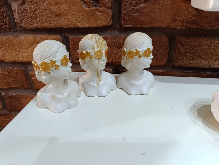 رنگآمیزی آن نقطهی قوت اصلی این کار است؛ سطح مجسمه با رگههای معدنی و رنگهای طبیعی پوشش داده شده و جلوهای خاص و لوکس به آن داده است. هر قطعه بهصورت کاملاً دستساز ساخته میشود، بنابراین هیچ دو مجسمهای دقیقاً مشابه هم نیست — همین ویژگی حس اصالت و کار هنری را به خریدار منتقل میکند.