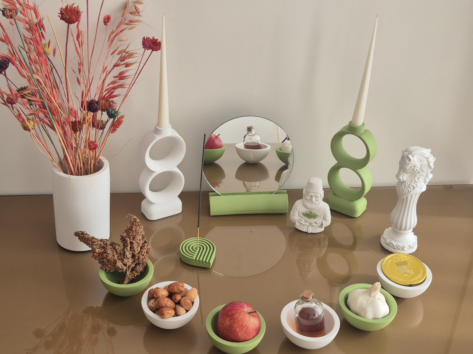 ۶ سین ،۲عدد جاشمعی مدرن،پایه آینه ،جاعودی حلزونی،مجسمه عمو نوروز،مجسمه دکوری اسب لاریس نماد سال،گلدان. استوانه